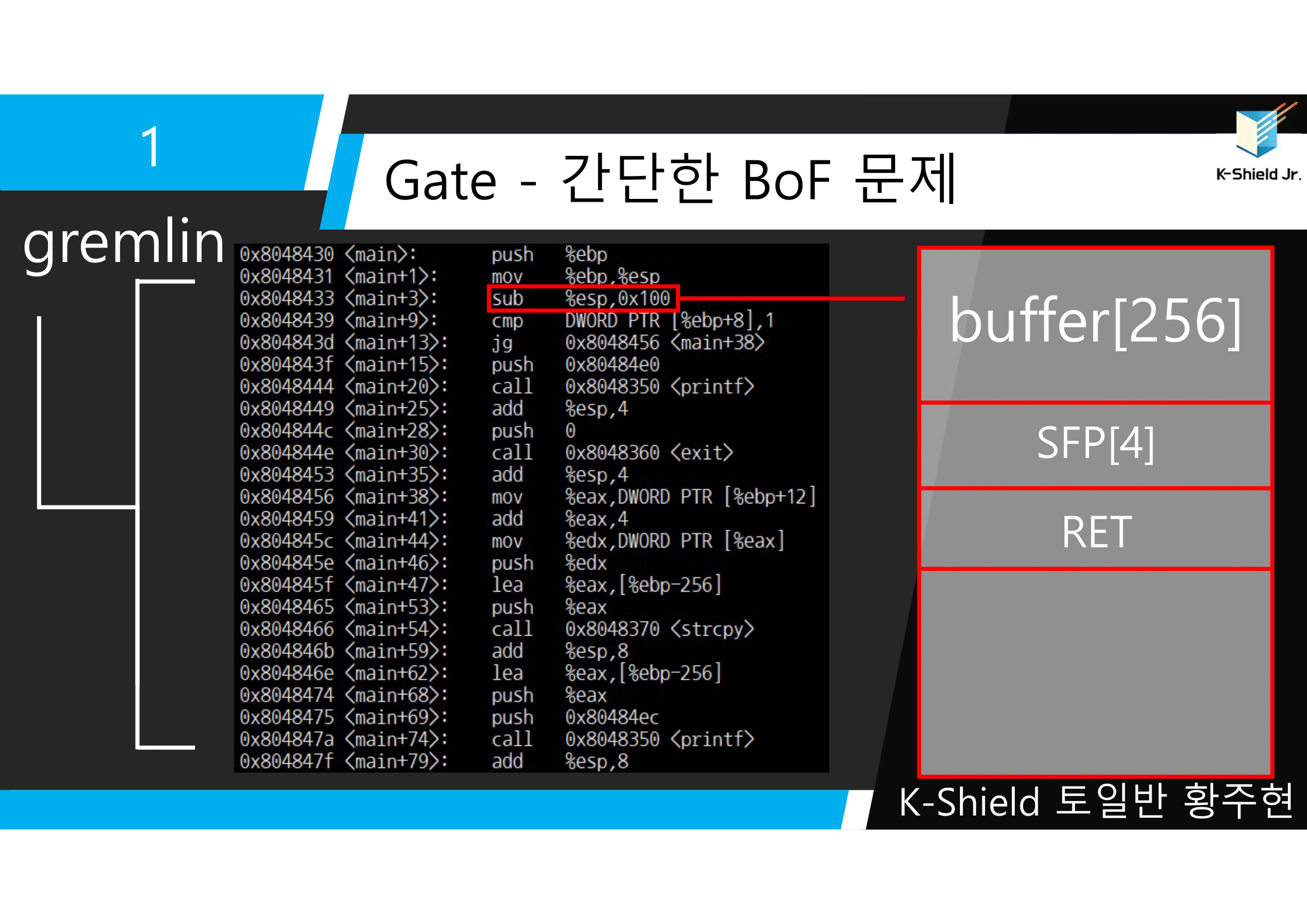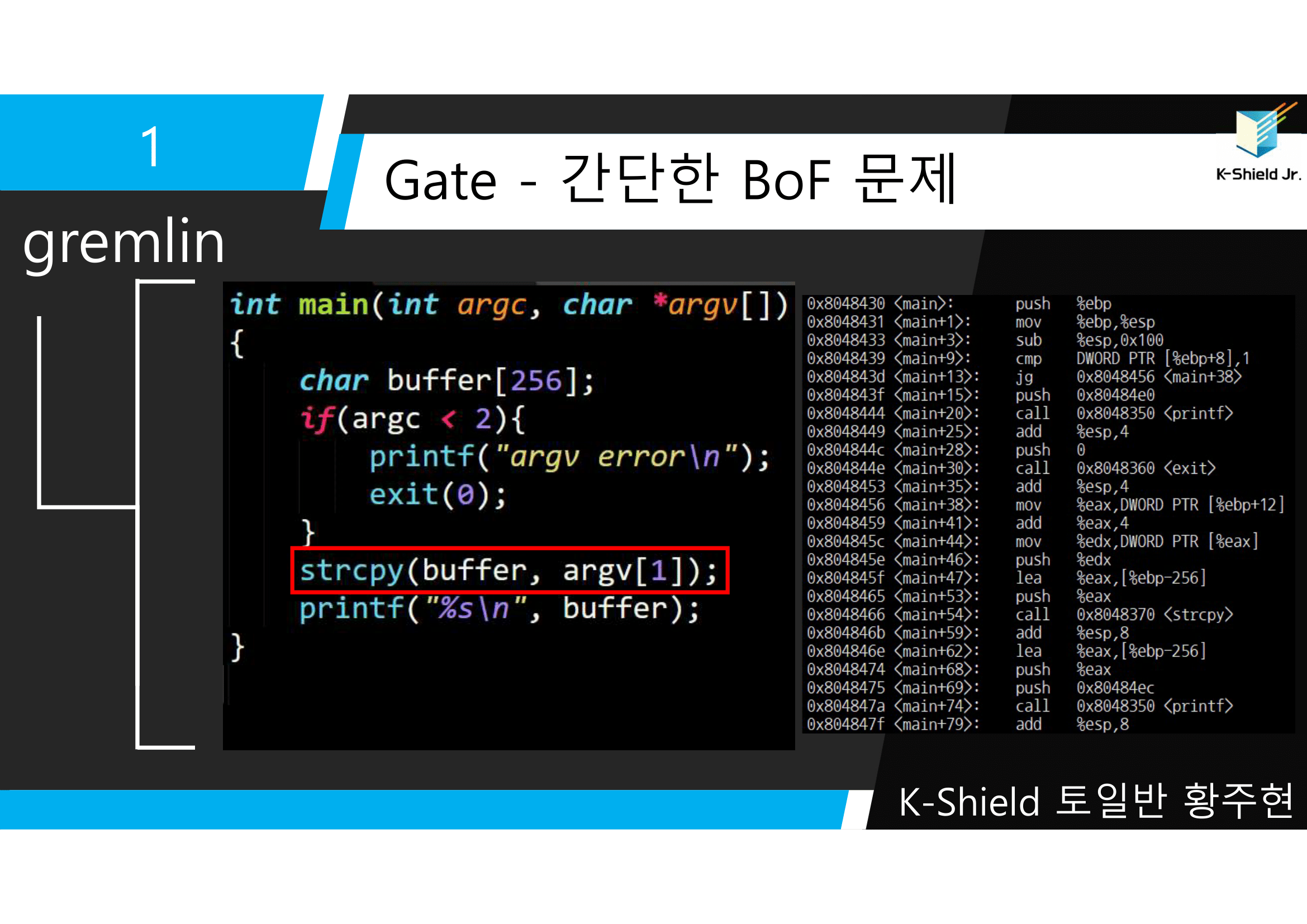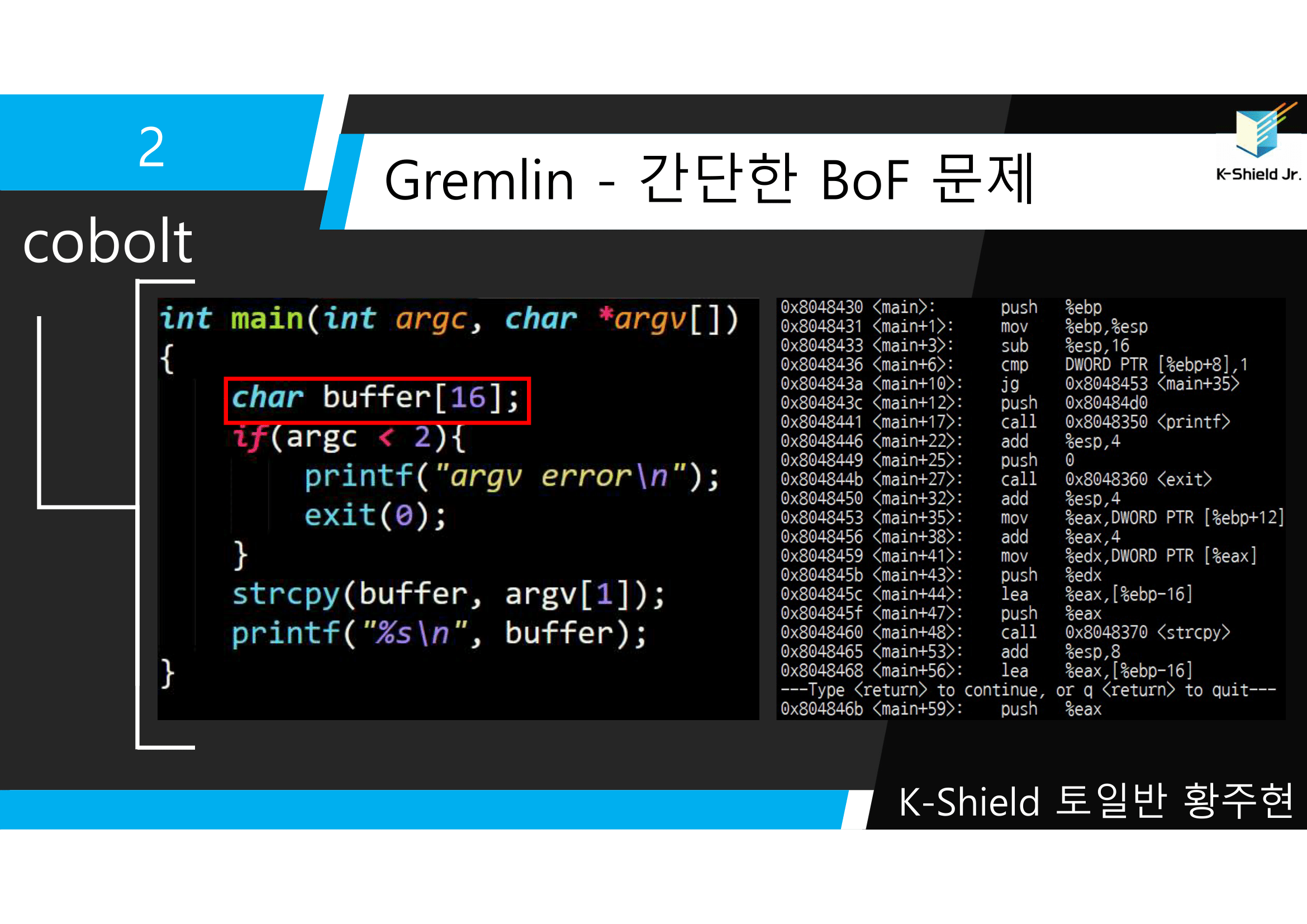 ▲ 소스코드로는 buffer를 16만큼 할당해 주고 인자값을 argv로 받는다. 그리고 strcpy로 첫번째 인자 값을 buffer에 복사해 준다. 우리는 해당 strcpy를 공격지점으로 잡는다.
