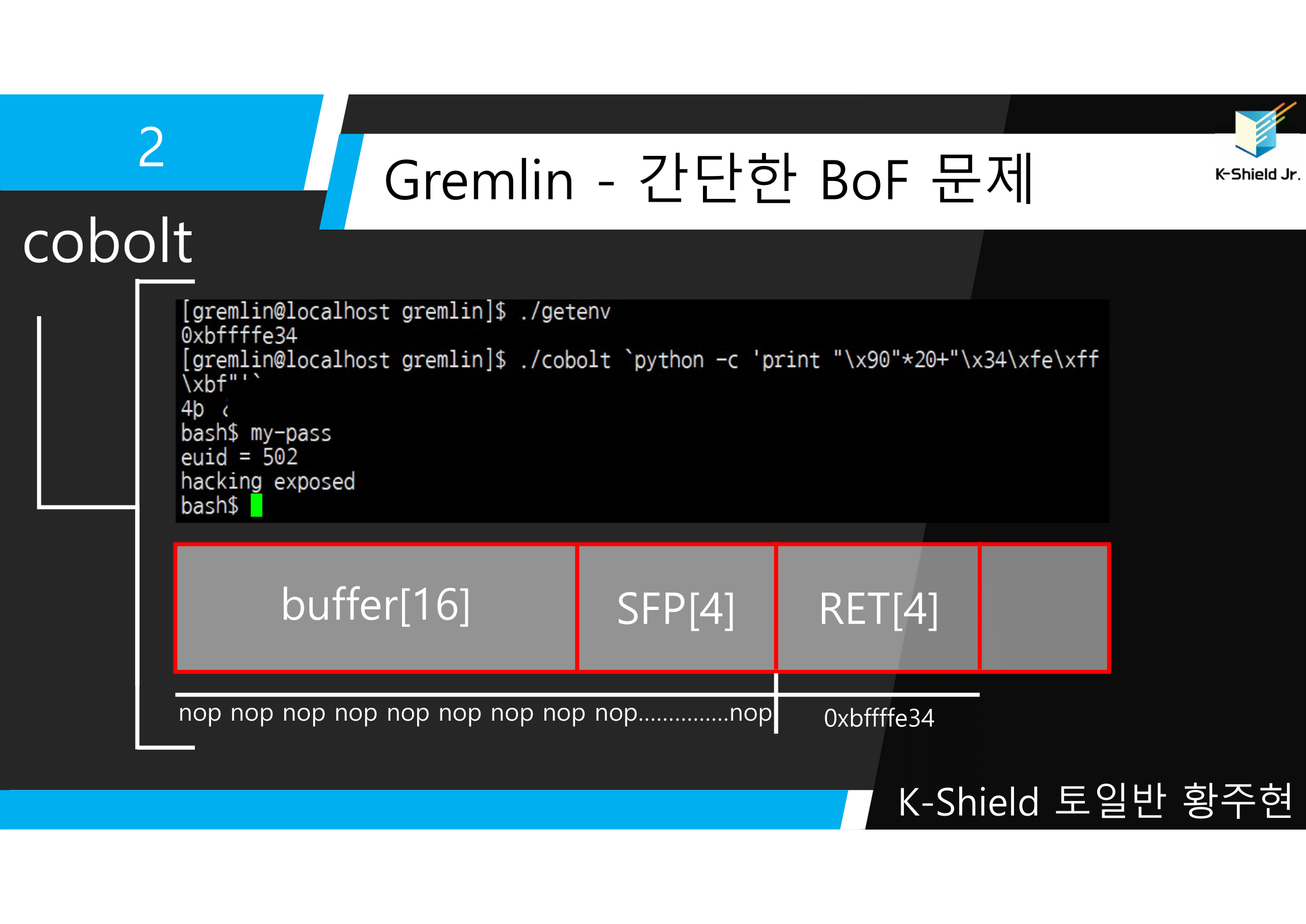 ▲ 이후는 1번 문제와 같다. EGG에 쉘을 넣은 환경변수를 만들고, 해당 시작 주소를 알아내 nop*(16+4) + EGGShell 을 입력해준다.