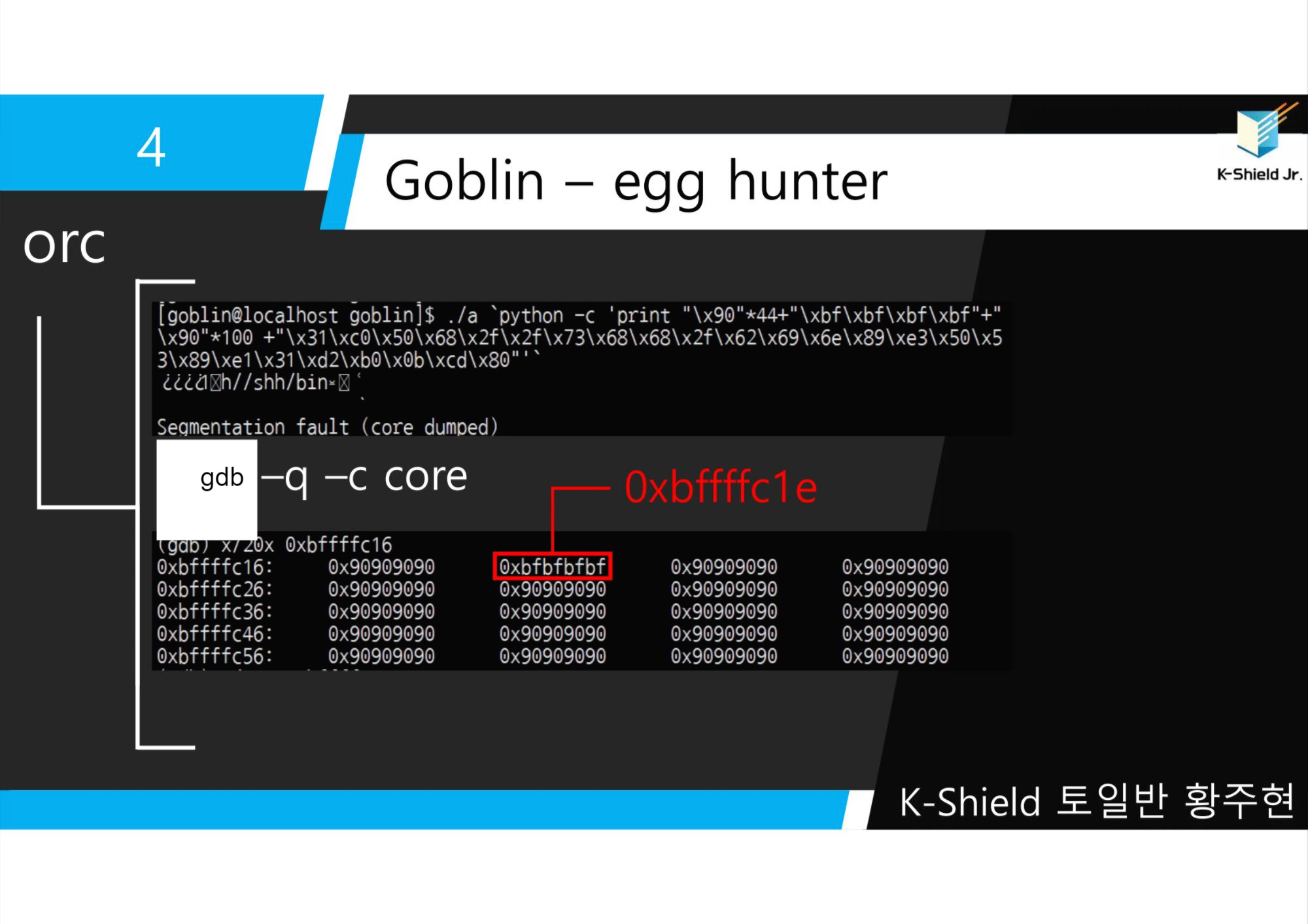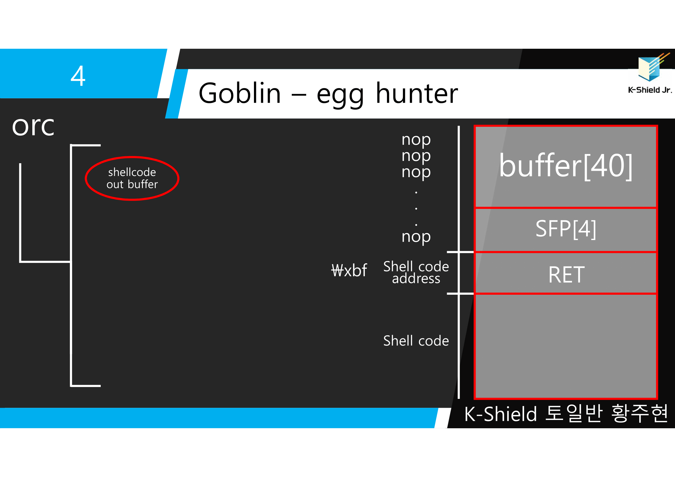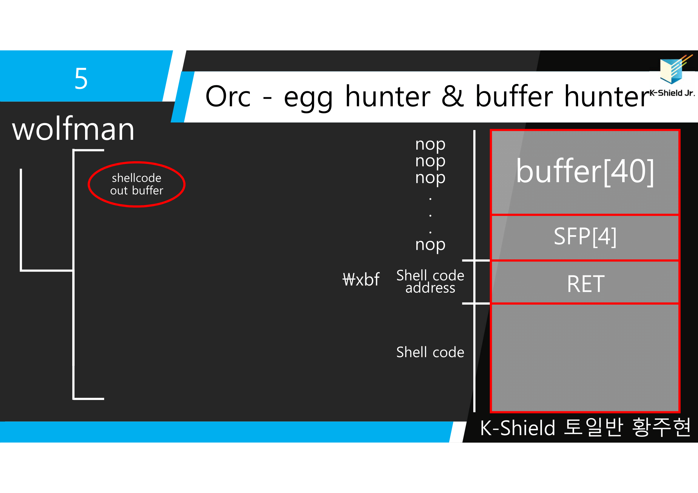 ▲ 기존에 4번에 존재했던 egghunter 이외에 buffer hunter가 추가되었다. memset으로 buffer에서 40만큼을 0으로 만들어 준다.